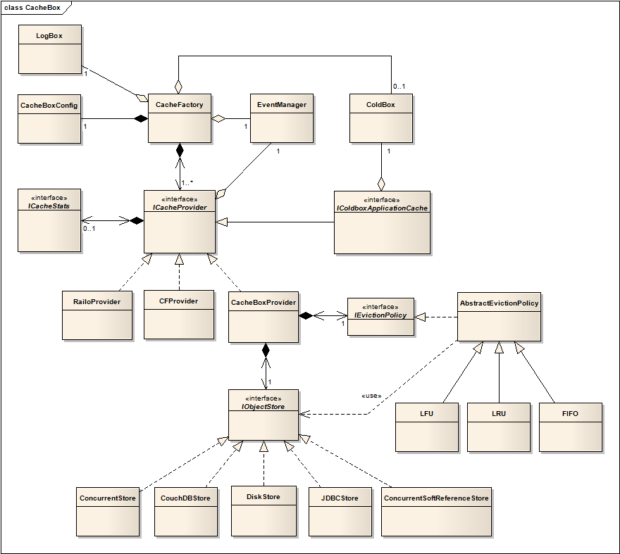Each object store is composed into a CacheBox provider for usage of storing and retrieving cached objects. The design principle behind each object store is that each object store implements its own locking, serialization, reading and writing mechanisms that are fronted by a nice API via the CacheBoxProvider object. Also, it is very important to note that the CacheBox eviction policies talk to the object stores in order to get ordered data structures for eviction purposes.